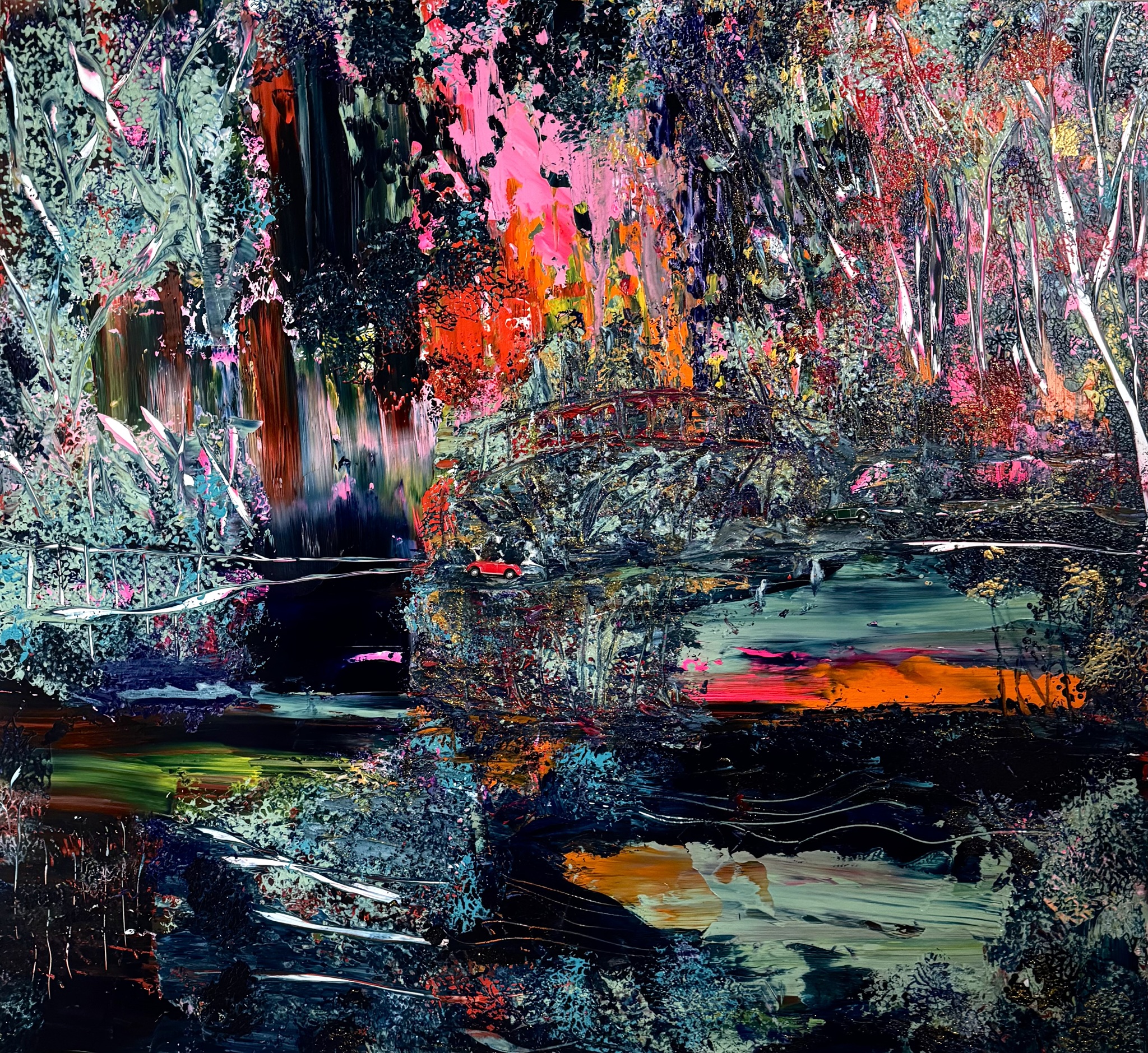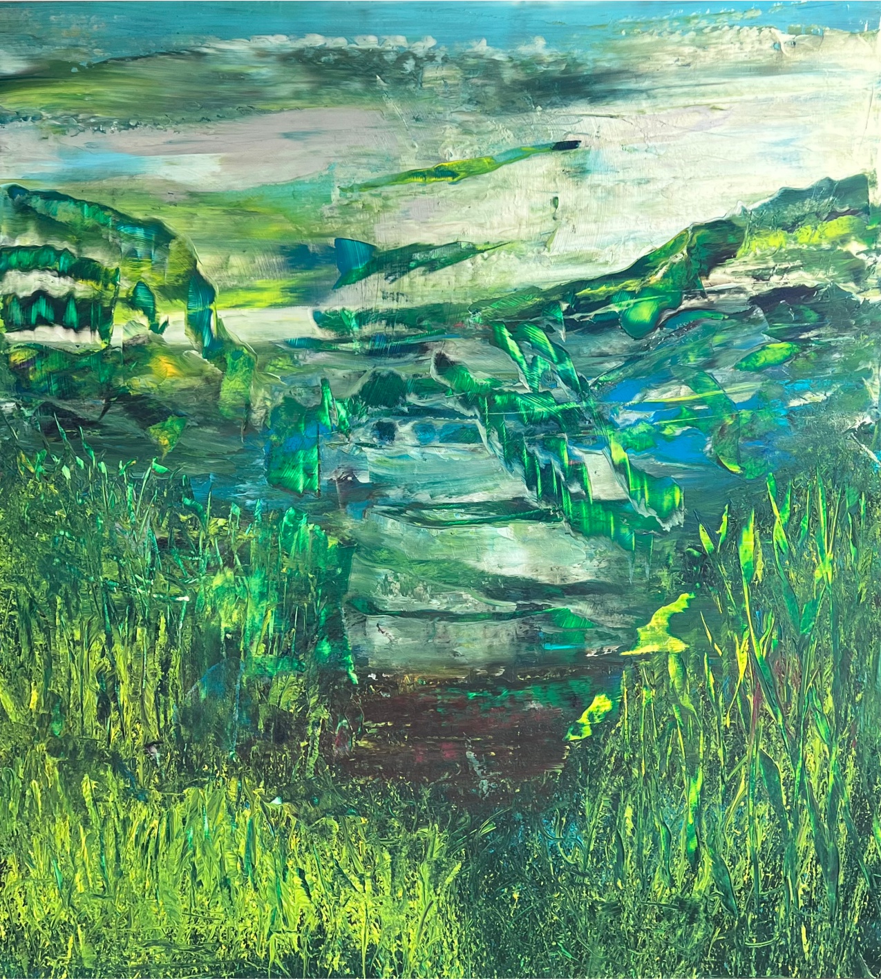 Gemälden sinnlich mit der Natur auseinander. Ihre Arbeiten balancieren Chaos und Ordnung und erinnern zugleich an die kindliche Freiheit des Spiels. Durch intuitives Mark Making und ausdrucksstarke Bewegungen entwickelt sie eine Bildsprache, die daran erinnert, dass es mehr gibt als das Sichtbare – und dass der Mensch tief mit der Natur verbunden ist. Mark Making, verstanden als das Erschaffen von Linien, Texturen und Formen, gilt bereits in der frühkindlichen Entwicklung als entscheidender Meilenstein für Kreativität und Sprache und erschließt vorbewusste Dimensionen.